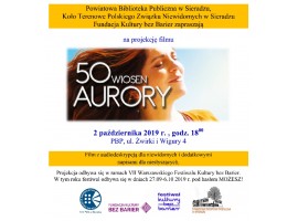 Powiatowa Biblioteka Publiczna w Sieradzu, Koło Terenowe Polskiego Związku Niewidomych w Sieradzu i Fundacja Kultury bez Barier zapraszają jutro projekcję filmu "50 wiosen Aurory". Będzie to seans z audiodeskrypcją dla niewidomych i dodatkowymi napisami dla niesłyszących, a rozpocznie się o godz. 18:00 w siedzibie PBP przy ul. Żwirki i Wigury 4 w Sieradzu.