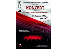 Uczniowie i nauczyciele Państwowej Szkoły Muzycznej I st. w Sieradzu zapraszają na koncert z okazji 100. rocznicy odzyskania przez Polskę niepodległości. Koncert rozpocznie się dziś o godz.18:00, wstęp wolny.