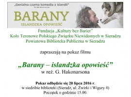 Fundacja "Kultury bez Barier", Koło Terenowe Polskiego Związku Niewidomych w Sieradzu i Powiatowa Biblioteka Publiczna w Sieradzu zapraszają na pokaz filmu "Barany - islandzka opowieść", który odbędzie się 20 lipca (środa) o godz 15:00 w bibliotece, ul. Żwirki i Wigury 4.