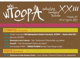 Jutro, 18 kwietnia, w Zduńskiej Woli rozpocznie się wielkie teatralne święto. WTOOPA - Ogólnopolskie Spotkania Teatralne odbędą się już po raz dwudziesty trzeci, a w Zduńskiej Woli miłośnicy teatru spotkają się po raz szósty. Przez trzy dni w sali widowiskowej Miejskiego Domu kultury Ratusz prezentować będą się grupy teatralne z całej Polski.