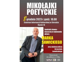 To wydarzenie, które wpisało się na stałe do kalendarza wydarzeń kulturalnych w Sieradzu, także w tym roku będzie okazja, żeby w Centrum Informacji Kulturalnej w grudniu posłuchać poezji. - W tym roku zmieniamy formułę naszego corocznego wydarzenia. Zamiast tradycyjnego spotkania autorskiego, odbędzie się mini spektakl z recytacją wierszy znanych poetów w wykonaniu aktora, Marka Sawickiego - zapowiadają organizatorzy.