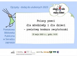Biblioteka powiatowa w Sieradzu, także w tym roku zaprasza do udziału w Powiatowym Konkursie Recytatorskim z cyklu "Opowiem Wam wierszem...". W tym roku konkurs nosi tytuł „Polscy poeci dla młodzieży i dla dzieci”. Termin zgłoszeń upływa w poniedziałek 8 maja o godz. 15:00.