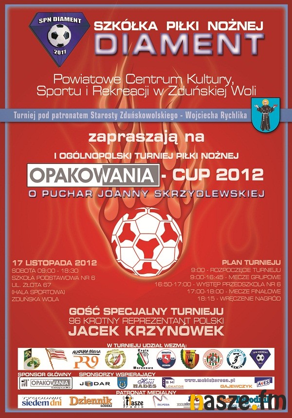 W sobotę 17. listopada do Zduńskiej Woli przyjadą dziecięce drużyny takich klubów, jak: Legia Warszawa, Widzew Łódź, Korona Kielce, Cracovia i kilku innych. Odbędzie się tu I Ogólnopolski Turniej Diament Opakowania Cup 2012 U-9.