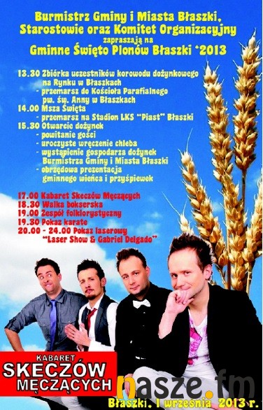 W Błaszkach po mszy świętej uczestnicy uroczystości przejdą na stadion Piasta, gdzie o godz. 15:30 zaplanowano oficjalne otwarcie dożynek. Będzie prezentacja dożynkowego chleba i wieńców. O 17:00 będzie występ Kabaretu Skeczów Męczących, a wieczorem pokaz laserowy. Z kolei w Stolcu w gminie Złoczew będą w niedzielę dożynki Diecezji Kaliskiej. To wydarzenie uświetni koncertem o 13:30 Golec Uorkiestra.