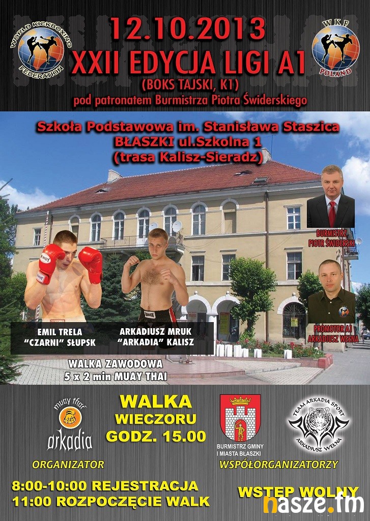 W sobotę 12 października w Błaszkach odbędzie się 22. edycja ligi A1. Kibice będą mogli zobaczyć walki boksu tajskiego i K1. W walce dnia zaprezentuje się błaszkowianin Arkadiusz Mruk reprezentujący barwy Arkadii Kalisz.