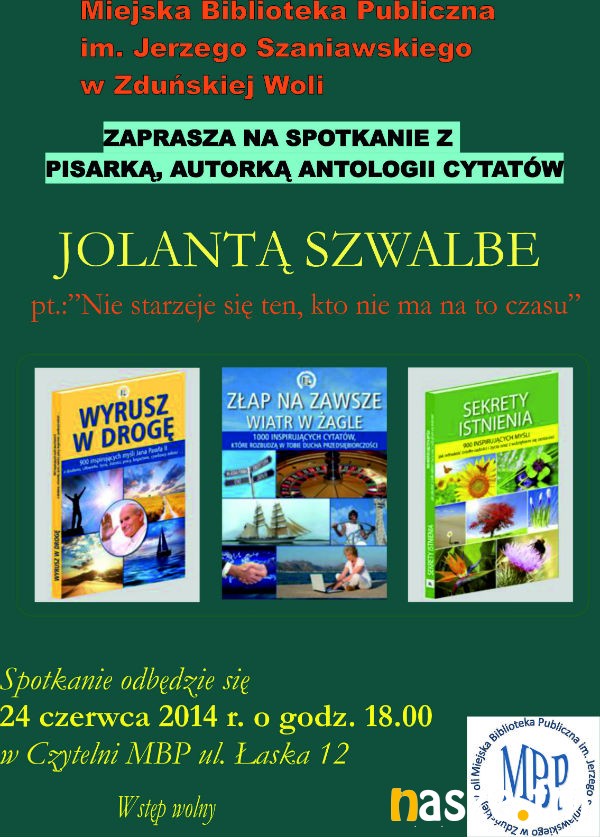 Miejska Biblioteka Publiczna w Zduńskiej Woli zaprasza na spotkanie autorskie z Jolantą Szwalbe, autorką inspirujących antologii cytatów i pierwszą edytorką.