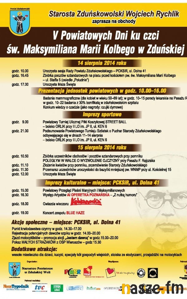 Powiatowe Dni ku czci św. Maksymiliana Kolbego rozpoczną się uroczystą się 14 sierpnia uroczystą sesją związaną z 15-leciem powiatu zduńskowolskiego. O godz. 10 na Pasażu Rajczaka rozpocznie się prezentacja jednostek powiatowych. Tam będzie można wykonać badanie mammograficzne, skorzystać z porad lekarskich czy wziąć udział w konkursach z atrakcyjnymi nagrodami. W zduńskowolskim szpitalu do samego wieczora będzie można skorzystać z badań lekarskich z 30 proc. bonifikatą. W tym dniu odbędzie się wiele imprez sportowych: turniej ulicznej koszykówki i podsumowanie Powiatowego Turnieju "Szóstek".