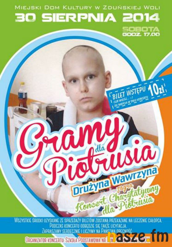 Apel o pomoc dla 14-letniego Piotrka ze Zduńskiej Woli, który zmaga się z chorobą nowotworową. W najbliższą sobotę w Miejskim Domu Kultury odbędzie się koncert charytatywny, z którego dochód zostanie przeznaczony na kosztowne leczenie młodego zduńskowolanina.