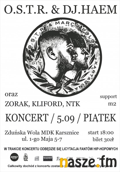 Razem z nim wystąpi DJ Haem, Zorak, Kliford i NTK, a supportem będzie m2. Początek koncertu o godz. 18. Bilety w cenie 30 zł. W trakcie imprezy przewidziano licytacje hip-hopowych gadżetów.