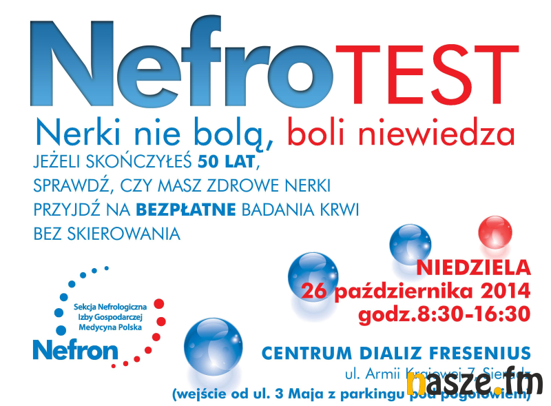 Osoby, które ukończyły 50 lat, będą miały okazję za darmo zbadać swoją krew pod kątem chorób nerek. W niedzielę, 26 października 2014 roku odbędzie się akcja NEFROTEST w Sieradzu. Jest to część ogólnopolskiej kampanii społecznej organizowanej przez Nefron Sekcję Nefrologiczną Izby Gospodarczej Medycyna Polska oraz Centrum Dializ Fresenius w Sieradzu. Na terenie całego kraju akcję wspiera Anna Komorowska oraz prof. Marian Klinger - krajowy konsultant w dziedzinie Nefrologii.