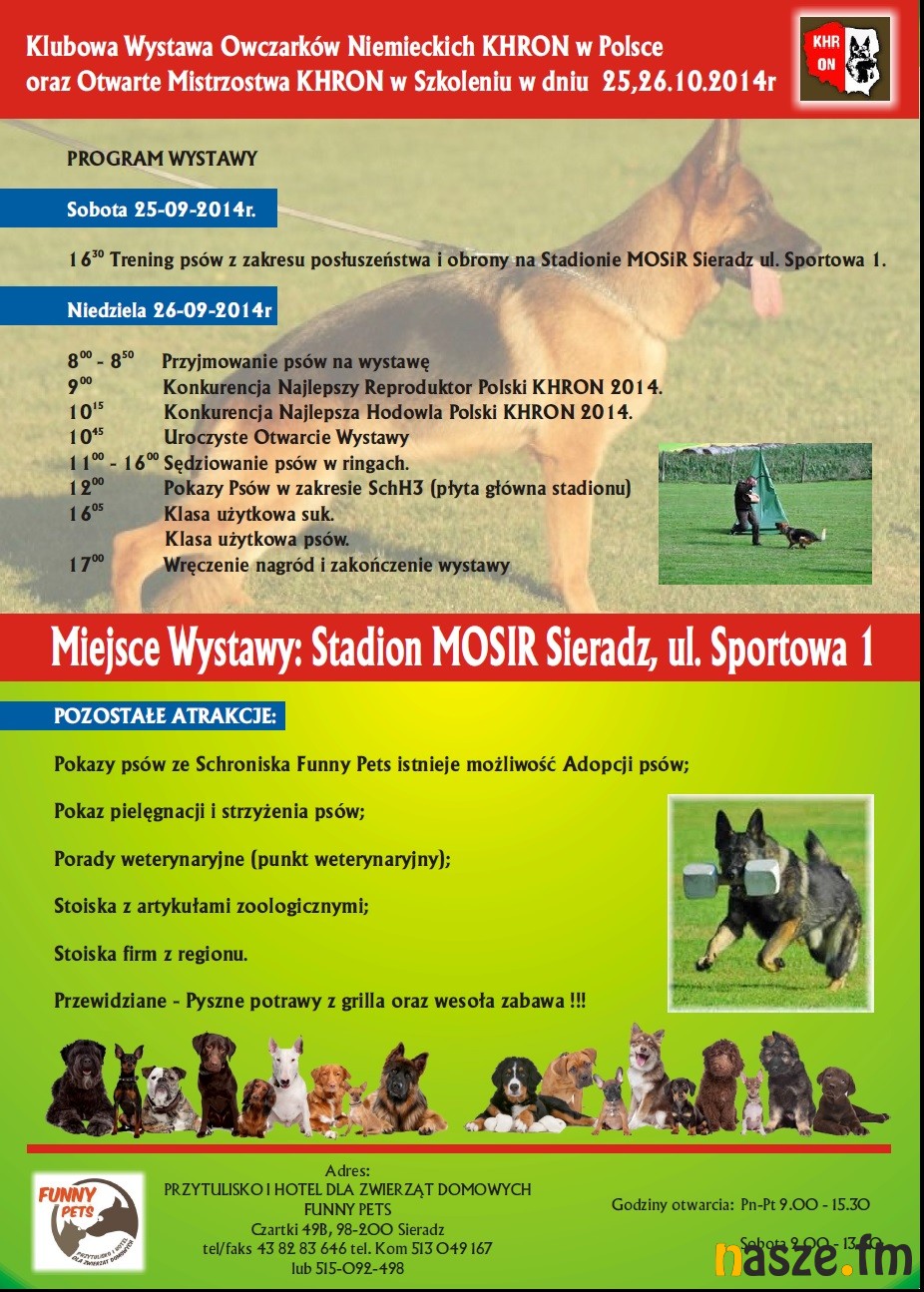 Ciekawa dwudniowa impreza będzie w najbliższy weekend w Sieradzu. To Klubowa Wystawa Owczarków Niemieckich KHRON oraz Otwarte Mistrzostwa KHRON w Szkoleniu. Zainteresowanych zapraszamy na stadion sieradzkiego MOSiR-u.