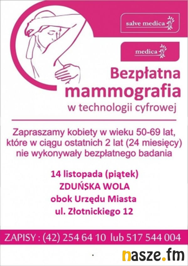 14 listopada obok Urzędu Miasta Zduńska Wola stanie mammobus. Z bezpłatnych badań mammograficznych będą mogły skorzystać kobiety między 50 a 69 rokiem życia, które w ciągu ostatnich 2 lat nie wykonywały mammografii w ramach profilaktyki zdrowotnej NFZ.