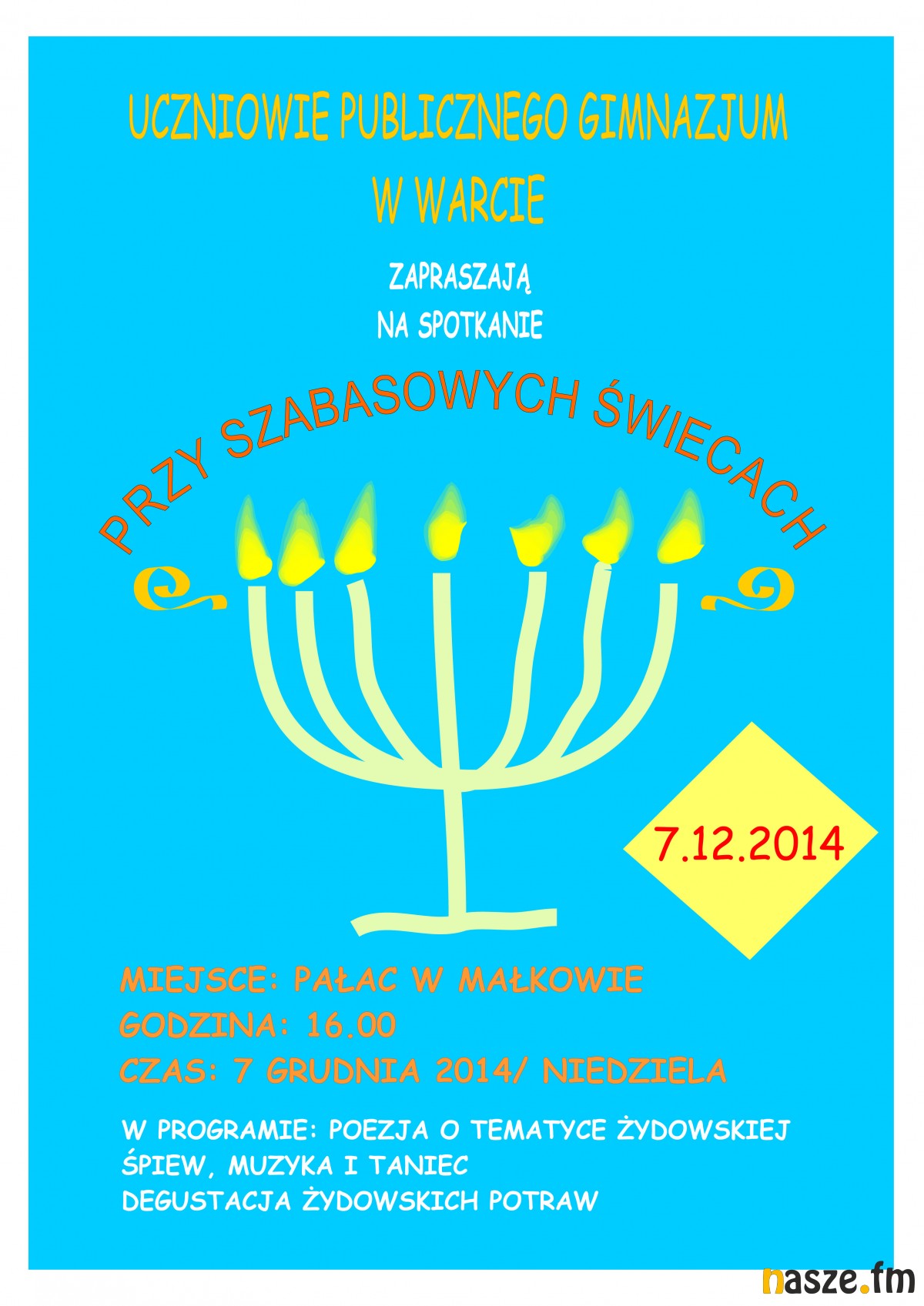 Spektakl przygotowany przez uczniów i nauczycieli z Publicznego Gimnazjum w Warcie "Przy szabasowych świecach" zostanie wystawiony o godz. 16:00, wstęp wolny. Będzie okazją do zapoznania się z muzyką, poezją, tańcami oraz potrawami żydowskimi. Występ w Małkowie ma charakter spotkania z kulturą i życiem codziennym dawnych mieszkańców Warty i jest kontynuacją wakacyjnych wydarzeń związanych z wizytą w tym mieście "Muzeum na kółkach".