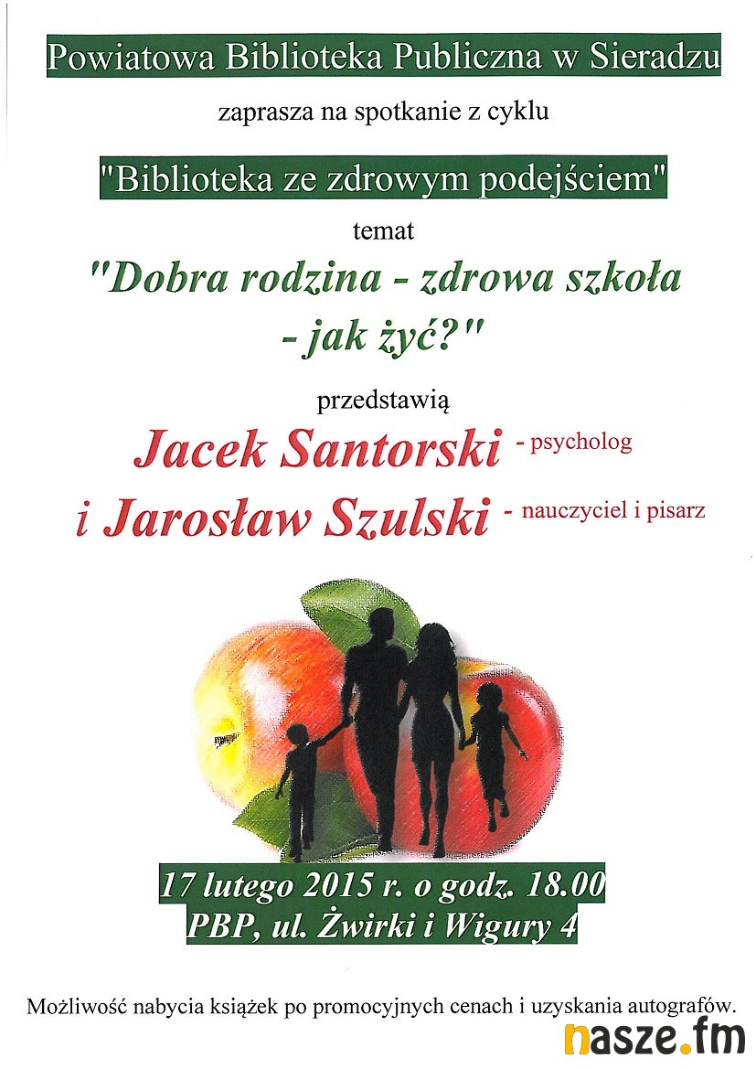 Te zagadnienia omówią podczas spotkania w PBP w Sieradzu Jacek Santorski - psycholog i Jarosław Szulski - nauczyciel i pisarz. Będzie to kolejne spotkanie w ramach cyklu "Biblioteka ze zdrowym podejściem", odbędzie się 17 lutego 2015 r. o godz. 18:00 w bibliotece przy ul. Żwirki i Wigury 4.