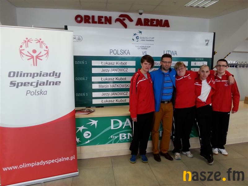 Aleksandra Stodulska, Sylwia Ubych, Adam Pająk i Mateusz Klimczak (uczniowie i absolwenci Specjalnego Ośrodka Szkolno-Wychowawczego w Sieradzu i zawodnicy Klubu Olimpiad Specjalnych "Spartakus" Sieradz) trzymali flagi państwowe Polski i Litwy, a następnie wspólnie z trenerem i opiekunem Piotrem Iszczkiem dopingowali naszych zawodników. Łukasz Kubot i Marcin Matkowski są ambasadorami Olimpiad Specjalnych, a sam wyjazd do Płocka - gdzie odbył się mecz - zbiegł się z obchodami Europejskiego Dnia Tenisa Olimpiad Specjalnych, który przypada właśnie dzisiaj. - Wyjazd na mecz tenisowy, wspólne zdjęcia i rozmowy z naszymi ambasadorami i pozostałymi zawodnikami (m.in. z Jerzym Janowiczem) zrobiły na całej czwórce ogromne wrażenie - powiedział nam Piotr Iszczek. - Jednocześnie nie było widać absolutnie żadnych różnic i barier między zawodowcami, a naszymi wychowankami, to pokazuje tylko, że tenis jest jeden dla wszystkich, niezależnie na jakim poziomie jest uprawiany - podkreśla wicedyrektor Specjalnego Ośrodka Szkolno-Wychowawczego z Sieradza, a jednocześnie koordynator odpowiedzialny za tenis w ruchu Olimpiad Specjalnych.