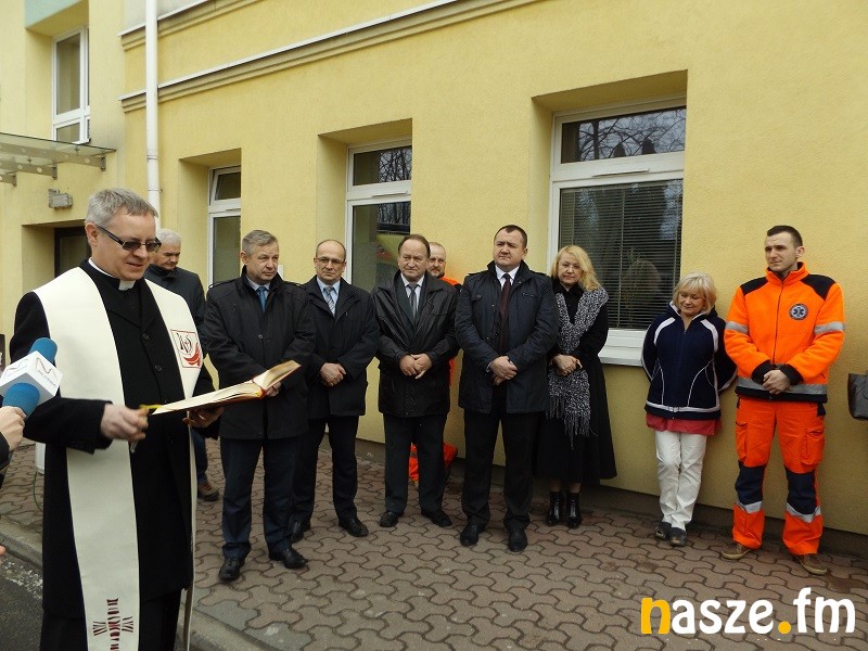 Nowy ambulans przekazano w obecności m.in. zarządu szpitala, lekarza pogotowia, ratownika medycznego, a także księdza Dariusza Kalińskiego.