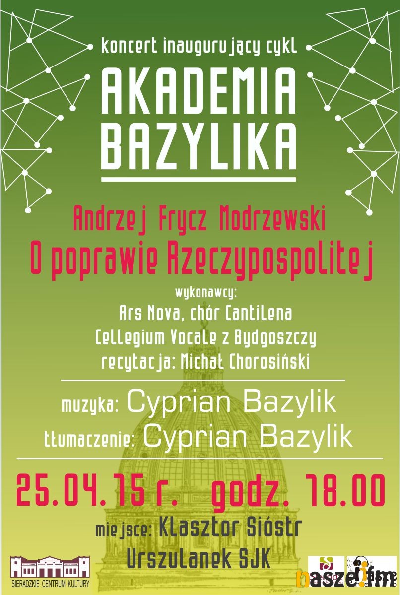 Podczas koncertu inaugurującego działalność akademii usłyszymy "O poprawie Rzeczypospolitej", tekst bazujący na traktacie Andrzeja Frycza Modrzewskiego, pisarza politycznego okresu renesansu. Tekst ten został przetłumaczony z łaciny przez Cypriana Bazylika. Recytował go będzie Michał Chorosiński. Podczas koncertu zabrzmi też renesansowa muzyka napisana przez sieradzkiego kompozytora.