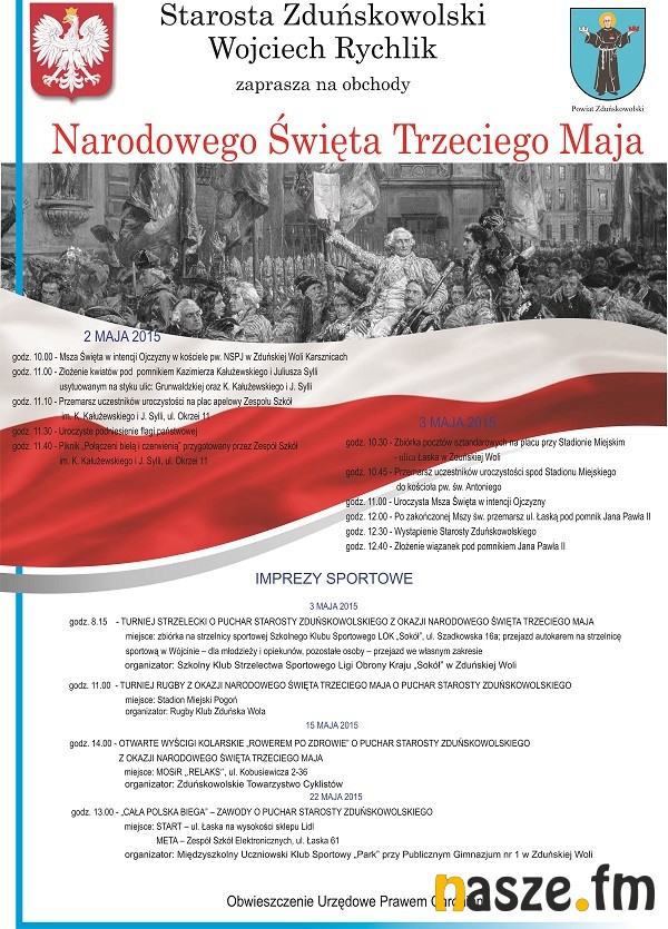 Uroczystości 3 maja w Zduńskiej Woli rozpoczną się o godz. 10:30 zbiórką pocztów sztandarowych na Stadionie Miejskim. Potem uczestnicy przejdą do kościoła pod wezwaniem św. Antoniego, gdzie odbędzie się msza św. Później uroczystości przeniosą się pod pomnik Jana Pawła II, gdzie wystąpi starosta zduńskowolski Wojciech Rychlik. Złożone zostaną również kwiaty.