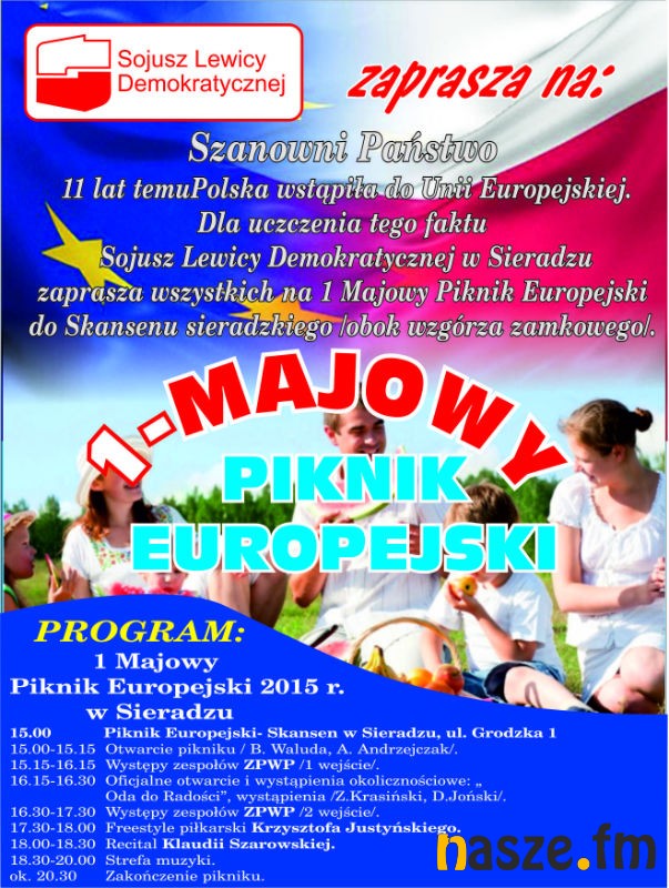 Obchody Święta Pracy odbędą się także w Sieradzu. O godz. 15 na terenie skansenu przy Wzgórzu Zamkowym rozpocznie się "1 Majowy Piknik Europejski". W programie m.in. występy młodych artystów z Zespołu Placówek Wychowania Pozaszkolnego, freestyle piłkarski, recital Klaudii Szarowskiej, strefa muzyki. Piknik potrwa do wieczora.
