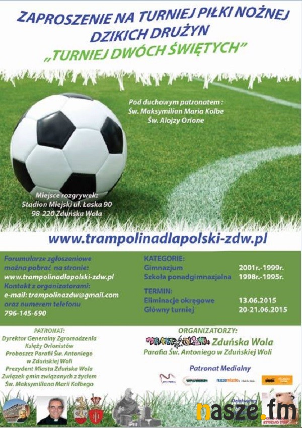 Klub Młodzieżowy "Trampolina" i Parafia Świętego Antoniego w Zduńskiej Woli organizują ogólnopolski turniej piłki nożnej TURNIEJ DWÓCH ŚWIĘTYCH. Eliminacje dla drużyn ze Zduńskiej Woli i okolic odbędą się dnia 13 czerwca 2015 r. o godzinie 10:00, na Stadionie Miejskim.