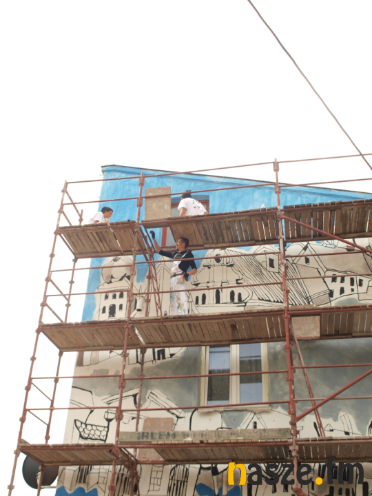- Malowanie muralu zaczęliśmy w sobotę od rozrysu, tj. nanosimy na ścianę szkic, na który następnie nakładamy kolory. Jeżeli nie spadnie deszcz najpóźniej jutro do południa planujemy skończyć - mówi Radosław Skrzypczyk z firmy Goodlooking, wykonawcy muralu.