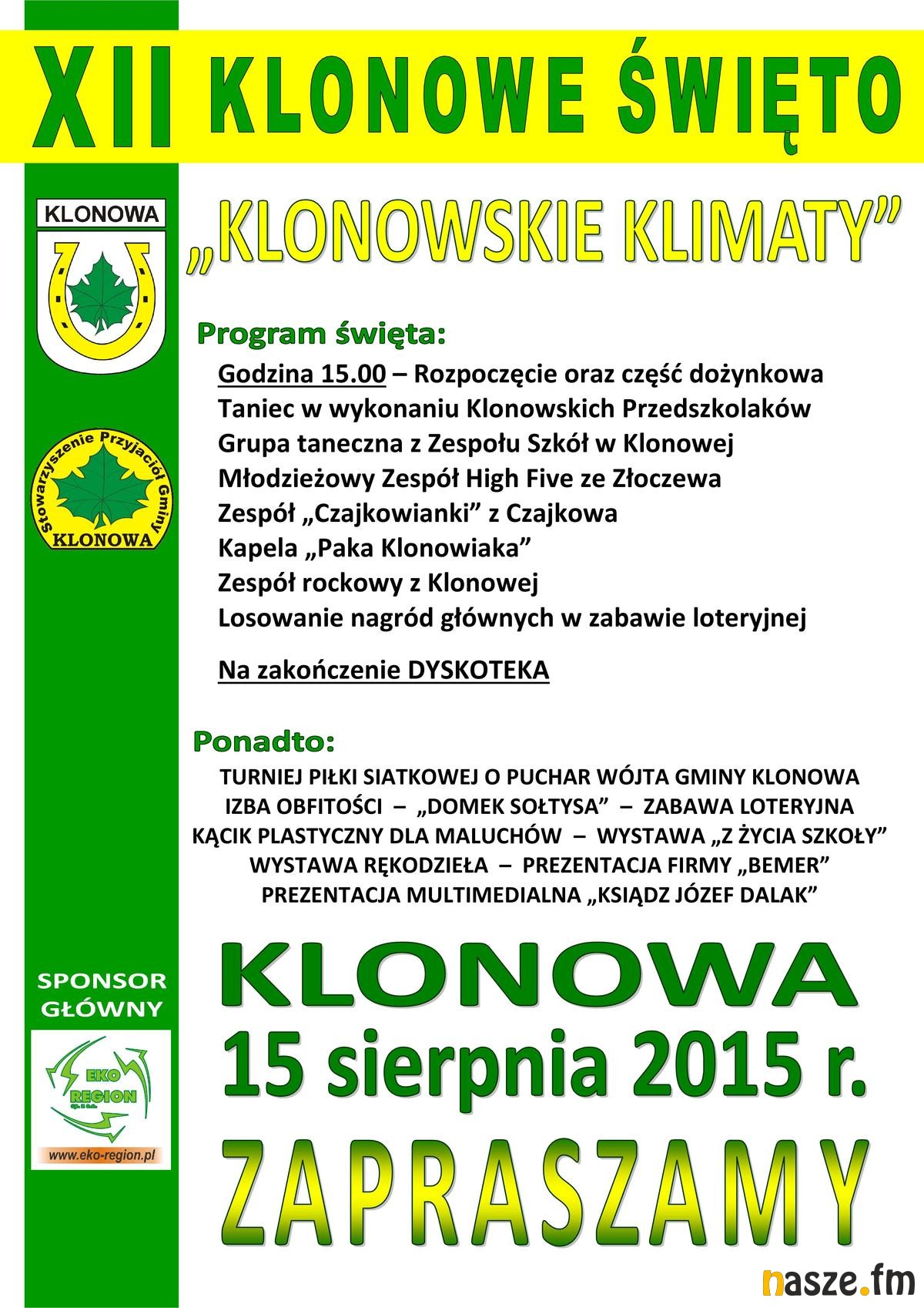 Po części dożynkowej gości będą bawili liczni lokalni artyści. Wystąpi chociażby zespół taneczny z miejscowego zespołu szkół; na scenie pojawią się też "Czajkowianki" oraz "Paka Klonowiaka". W ramach festynu rozegrany zostanie turniej siatkówki o puchar wójta Klonowej. Chętni będą mogli obejrzeć specjalną wystawę rękodzielnictwa. Na swój kącik artystyczny będą mogli liczyć najmłodsi uczestnicy imprezy. Szczegóły na plakacie.