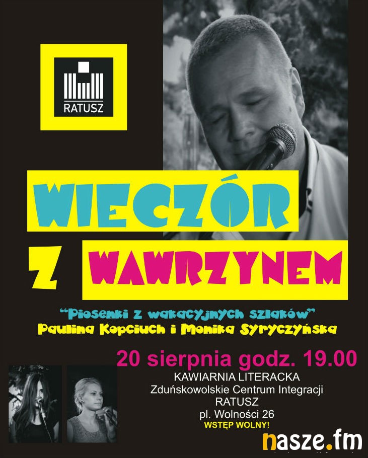 W ramach cyklu "Wieczór z Wawrzynem", Andrzej Wawrzyniak prezentuje działania artystyczne swojego autorstwa oraz zaproszonych gości. Tym razem u jego boku wystąpią: Monika Syryczyńska oraz Paulina Kopciuch. Początek tego wydarzenia o godz. 19:00. Wstęp wolny.