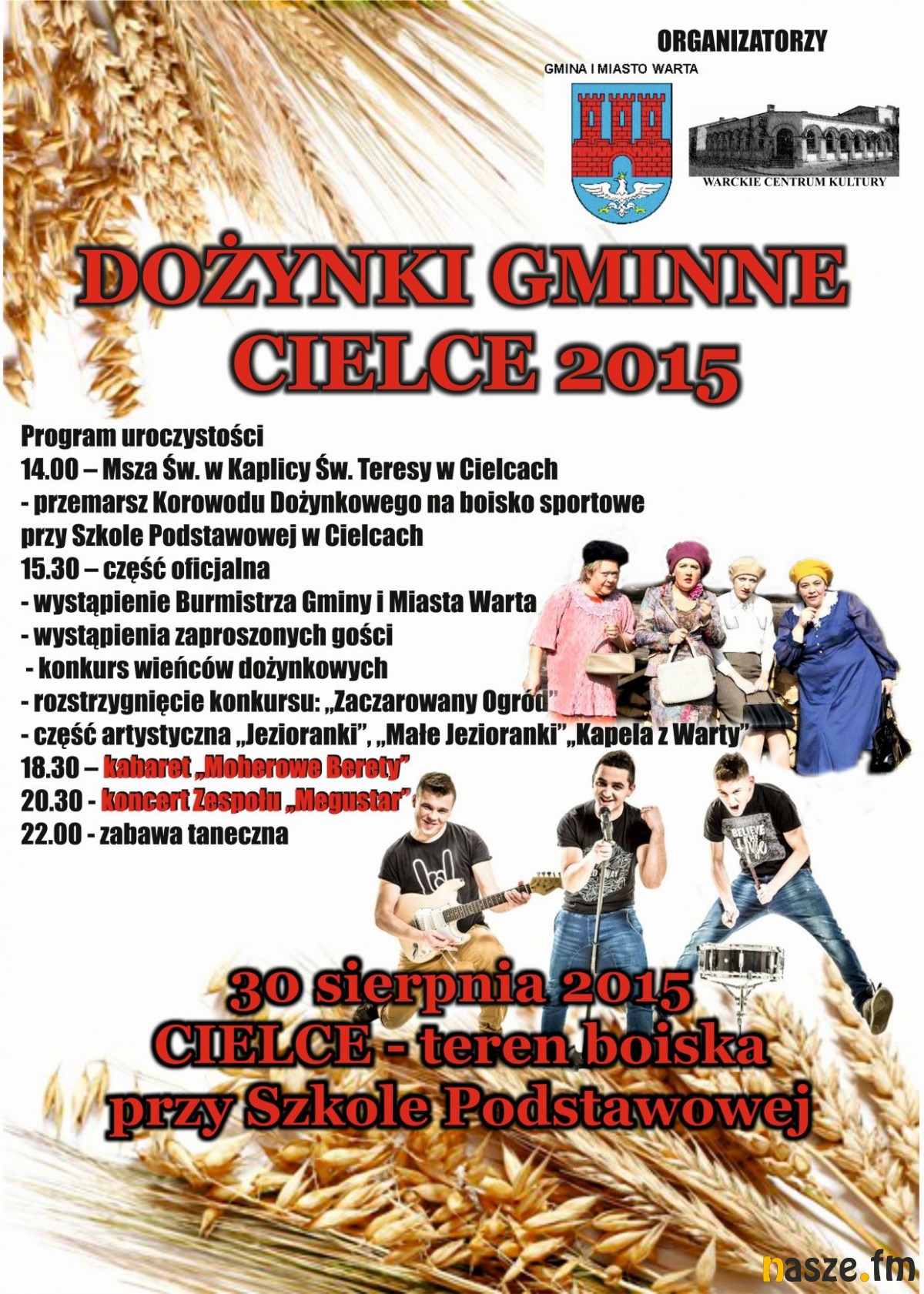 Dożynki będą tym razem w Cielcach. Po uroczystej mszy świętej w miejscowym kościele kolorowy korowód przejdzie na boisko szkolne, gdzie odbędzie się dalsza część dożynek. To tam odbędzie się część obrzędowa. Warckie dożynki uświetnią też akcenty artystyczne. Obok rodzimych artystów będzie chociażby koncert zespołu Megustar. Dożynki w Cielcach odbędą się w niedzielę 30.08.br. Szczegóły na plakacie.