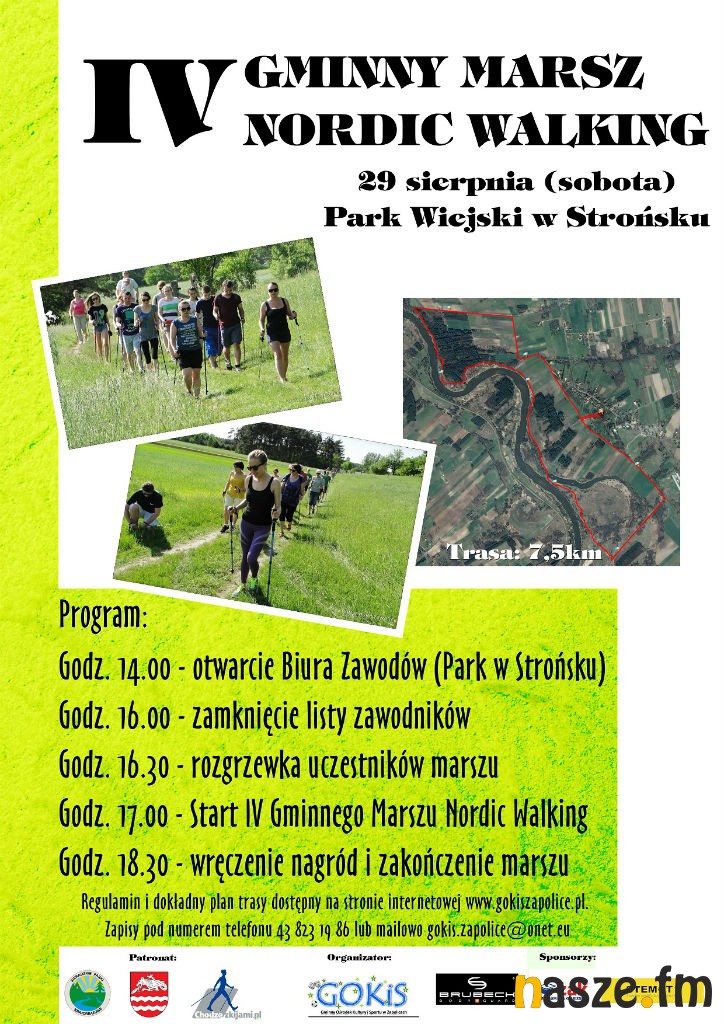 W tym roku organizatorzy wprowadzili zmianę lokalizacji marszu. Odbędzie się on w Strońsku, a nie jak dotychczas w Zapolicach. Start zaplanowano o godz. 17.00 z Parku Wiejskiego w Strońsku. Wcześniej, bo już o godz. 14.00 otwarte zostanie biuro zawodów. Osoby, które nie zgłoszą wcześniej chęci udziału w imprezie będą mogły to zrobić w sobotę. Tuż przed startem odbędzie się rozgrzewka przeprowadzona przez instruktorów.