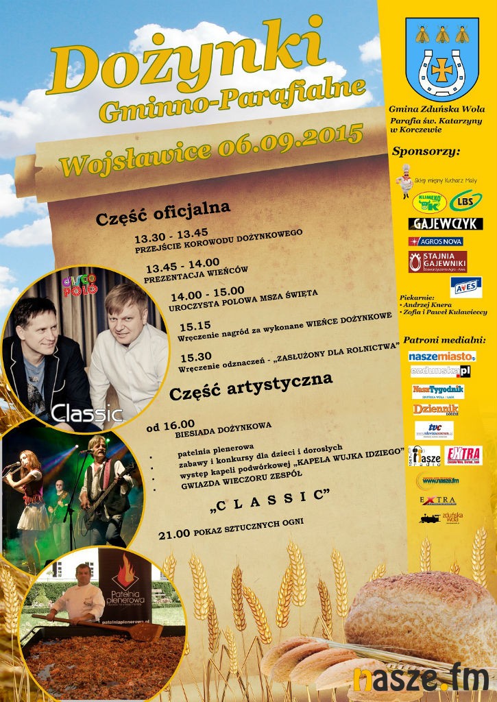 W najbliższą niedzielę (06.09) rolnicy z gminy Zduńska Wola podziękują za plony. Na terenie Szkoły Podstawowej w Wojsławicach odbędą się Dożynki Gminno-Parafialne. Oprócz części obrzędowej przewidziano biesiadę dożynkową z wieloma atrakcjami.
