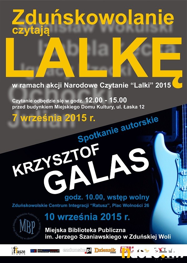 Drugie wydarzenie to spotkanie autorskie z Krzysztofem Galasem, niewidomym poetą, członkiem Związku Literatów Polskich Oddział w Poznaniu. Pan Krzysztof jest twórcą cyklu felietonów literackich pod tytułem „Widzieć intelektem” oraz felietonów dotyczących spraw niewidomych. Włączając się w obchody Narodowego Czytania, spotkaniu towarzyszyć będzie wspólne czytanie „Lalki” B. Prusa przez Naszego Gościa, osoby zaproszone oraz młodzież szkół ponadgimnazjalnych. Spotkanie odbędzie się 10 września o godz. 10.00 w sali kameralnej Zduńskowolskiego Centrum Integracji „Ratusz&rdquo, Pl. Wolności 26.