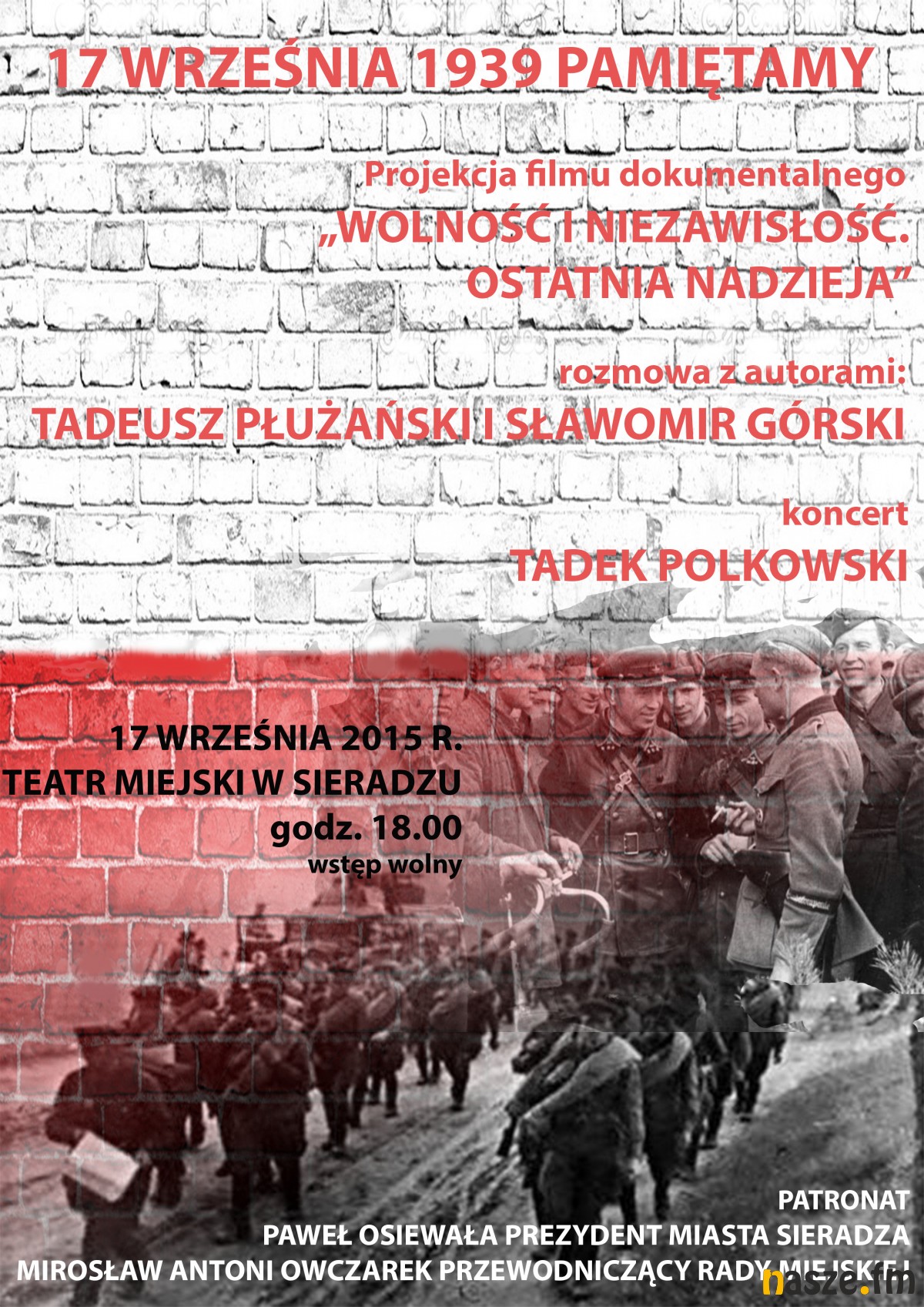 W Teatrze Miejskim w Sieradzu będzie można zobaczyć film "Wolność i Niezawisłość. Ostatnia nadzieja" w reżyserii Sławomira Górskiego. Po projekcji będzie rozmowa z autorami filmu oraz koncert Tadka Polkowskiego. Początek spotkania w SCK o godz. 18, wstęp będzie wolny.