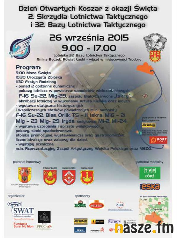 Dzień Otwarty Koszar organizuje w najbliższą sobotę 32. Baza Lotnictwa Taktycznego w Łasku. Z tej okazji na płycie łaskiego lotniska odbędzie się festyn rodzinny. Nie zabraknie pokazów lotniczych, występów oraz atrakcji dla dzieci.