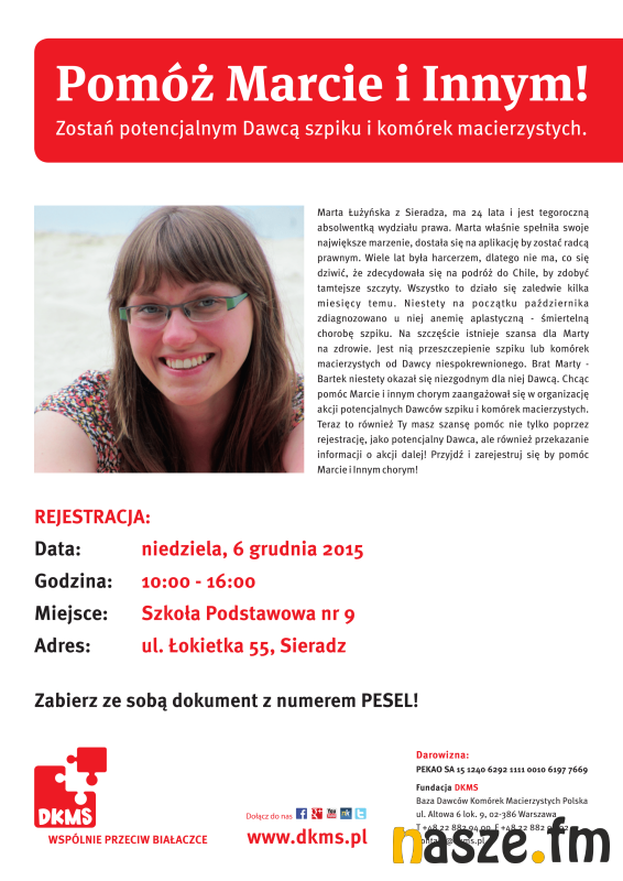 Dawca szpiku dla sieradzanki, Marty Łużyńskiej, nadal jest pilnie poszukiwany. Marta zapadła w październiku tego roku na ciężką chorobę układu krwiotwórczego, anemię aplastyczną. Uratować jej życie może tylko przeszczep szpiku kostnego. Jedyną szansą jest zapisanie się do banku szpiku i będzie ku temu okazja.