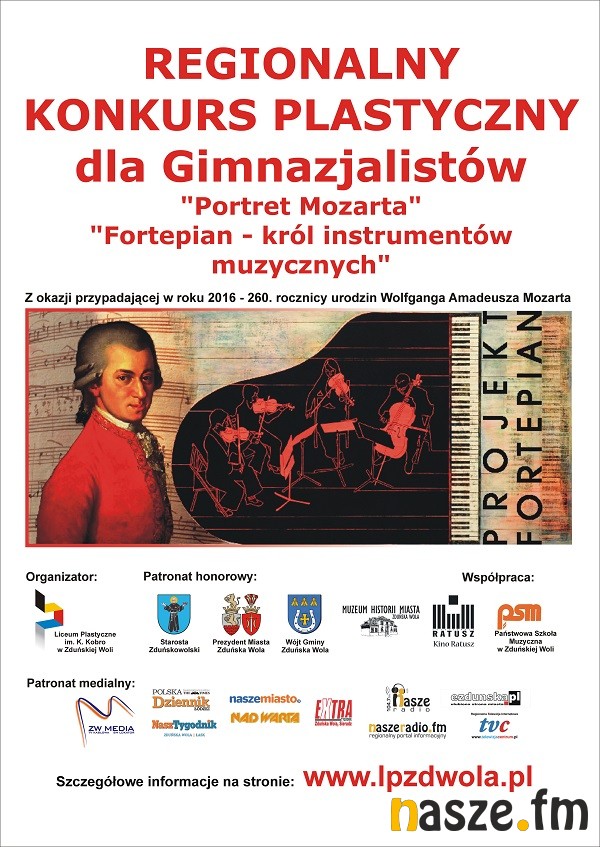 Uczniowie - Młodzi Artyści z powiatów: zduńskowolskiego, łaskiego, pabianickiego, sieradzkiego, bełchatowskiego, poddębickiego – Liceum Plastyczne w Zduńskiej Woli zaprasza do udziału w Regionalnym Konkursie Plastycznym o dwóch tytułach: "Portret Mozarta", "Fortepian -król instrumentów muzycznych".