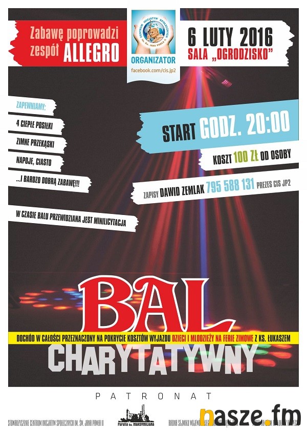 Zduńskowolskie Stowarzyszenie Centrum Inicjatyw Społecznych im. Jana Pawła II organizuje Bal Charytatywno-Karnawałowy. Chodzi w nim o to, by oprócz dobrej zabawy zebrać pieniądze na wyjazd dzieci i młodzieży na zimowisko.