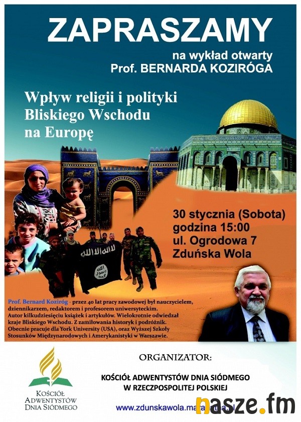 Kościół Adwentystów Dnia Siódmego w Zduńskiej Woli zaprasza na wykład profesora Bernarda Koziróga pt. "Wpływ religii i polityki Bliskiego Wschodu na Europę".