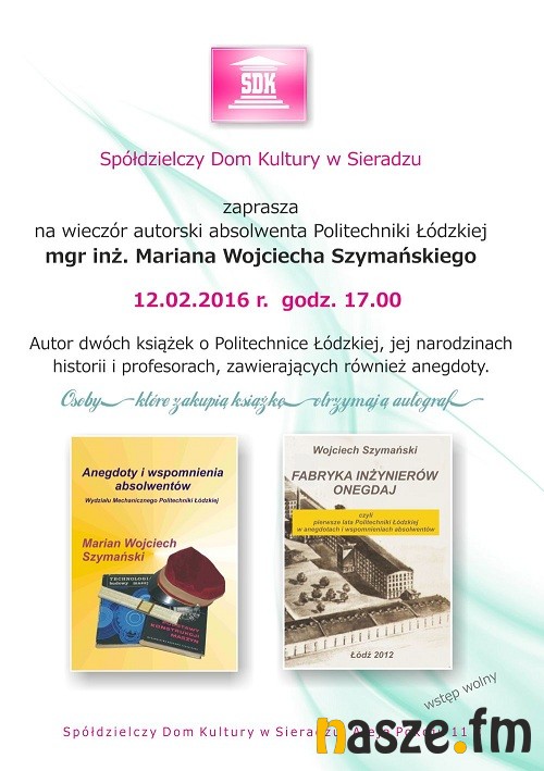 Historia Politechniki Łódzkiej w barwnych anegdotach. To propozycja mgr inż. Mariana Wojciecha Szymańskiego, bo dzieje tej uczelni, jej kadry naukowej, opisuje w dwóch swoich książkach. I to im będzie poświęcone spotkanie w Spółdzielczym Domu Kultury w Sieradzu. Zaplanowano je na piątek 12 lutego, początek o godz. 17:00, wstęp wolny.