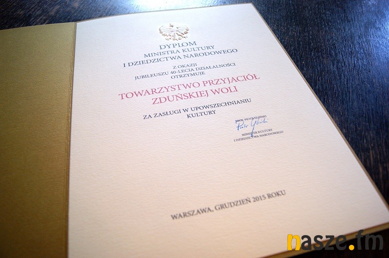 Towarzystwo Przyjaciół Zduńskiej Woli zostało nagrodzone dyplomem Ministra Kultury i Dziedzictwa Narodowego za zasługi w upowszechnianiu kultury.