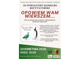 Powiatowa Biblioteka Publiczna w Sieradzu zaprasza młodzież do udziału w IX edycji Powiatowego Konkursu Recytatorskiego "Opowiem Wam wierszem...". Konkurs skierowany jest do uczniów klas V-VIII szkół podstawowych oraz uczniów klas I i II szkół średnich z terenu powiatu sieradzkiego.