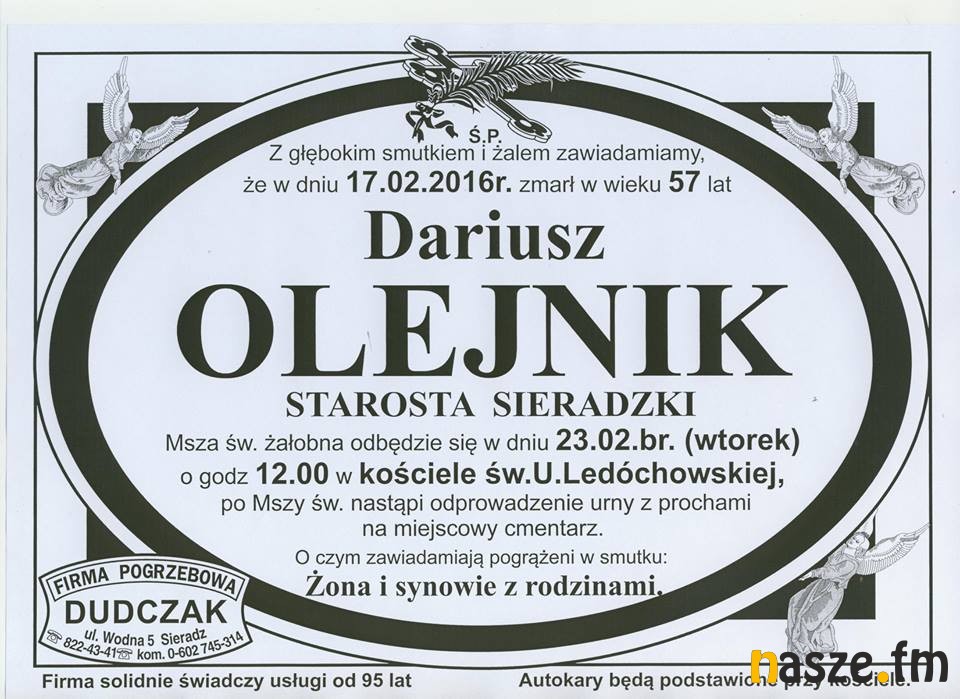 Znana jest już data pogrzebu zmarłego w minioną środę Dariusza Olejnika, starosty powiatu sieradzkiego. Uroczystość pogrzebowa odbędzie się we wtorek (23.02.br.) w kościele parafii Świętej Urszuli Ledóchowskiej w Sieradzu Monicach o godz. 12.