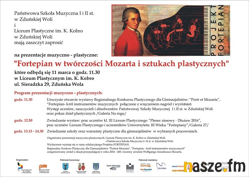 Jutro warto zajrzeć do Liceum Plastycznego w Zduńskiej Woli. W murach szkoły odbędzie się otwarcie wystawy Regionalnego Konkursu Plastycznego "Portret Mozarta" i "Fortepian król instrumentów muzycznych", która połączona zostanie z wręczeniem laureatom nagród i wyróżnień.