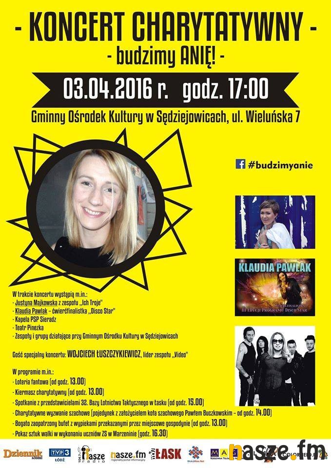 W niedzielę, 3 kwietnia w Gminnym Ośrodku Kultury w Sędziejowicach odbędzie się koncert charytatywny pod hasłem "Budzimy Anię!". Cały dochód z imprezy zostanie przeznaczony dla mieszkanki gminy Sędziejowice, która uległa wypadkowi samochodowemu.