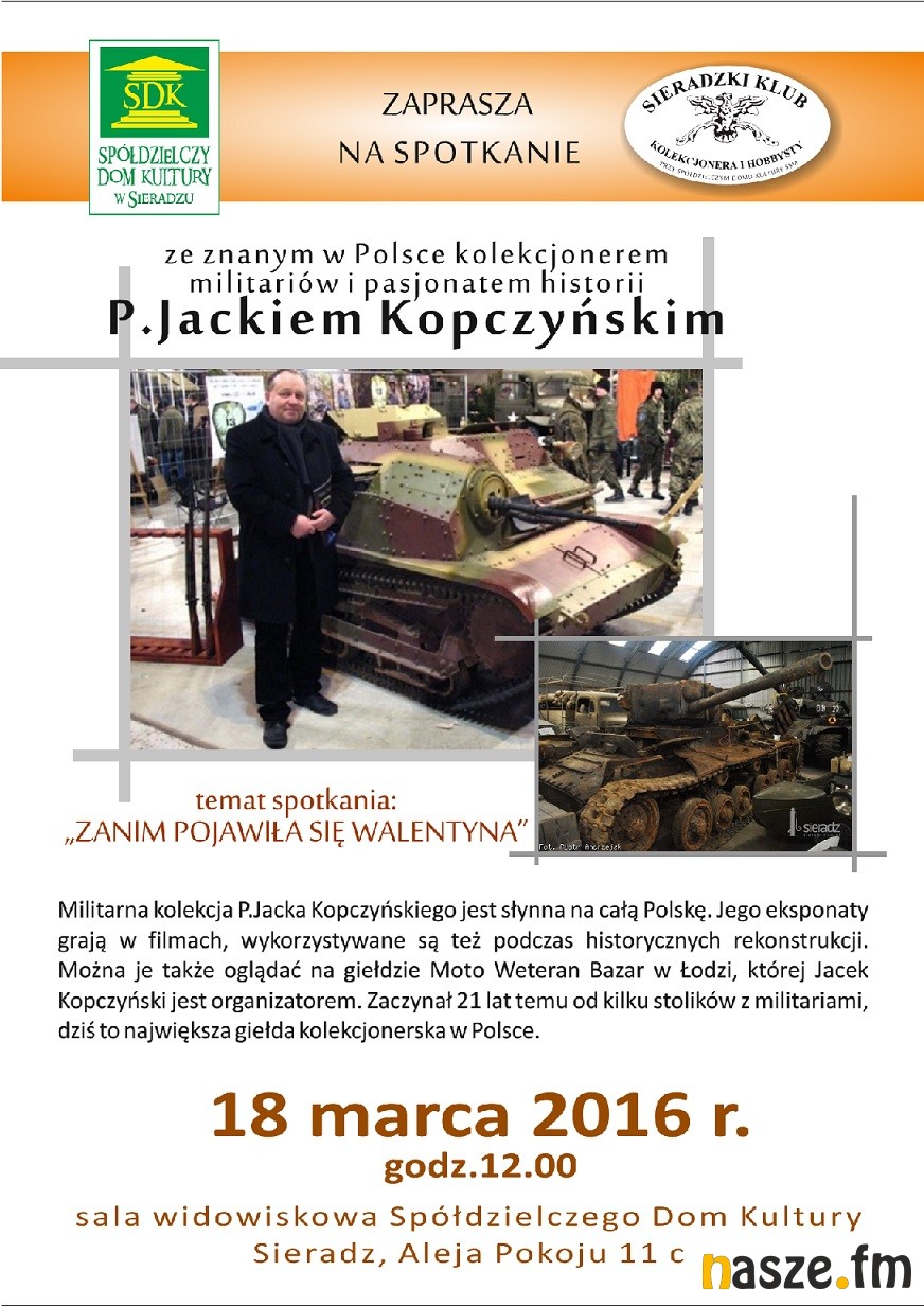 Jacek Kopczyński ma obecnie pokaźną kolekcję pojazdów militarnych. W naszej części regionu zrobiło się o kolekcjonerze głośno po tym, jak podjął wraz ze swą ekipą udaną próbę wyciągnięcia ze starorzecza rz. Warty w msc. Warta czołgu z okresu II Wojny Światowej znanego jako "Walentyna". Eksponaty będące w kolekcji Jacka Kopczyńskiego często grają w filmach; są też wykorzystywane podczas rekonstrukcji historycznych. Można je ponadto oglądać w Łodzi na Moto Weteran Bazar. Spotkanie z Jackiem Kopczyńskim w najbliższy piątek o godz. 12 w SDK w Sieradzu. Wstęp wolny.