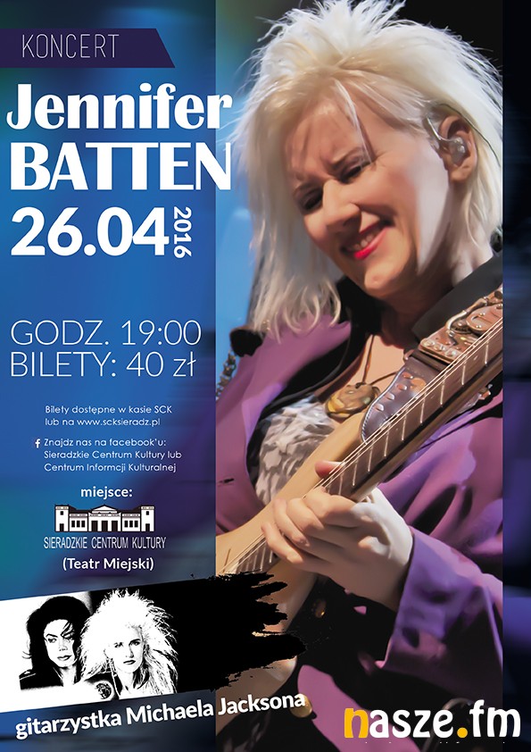 Jennifer Batten gitarzystka, którą mogliśmy podziwiać u boku Michaela Jacksona wystąpi na koncercie w Sieradzu. Jej nastroszoną blond czuprynę i porywające riffy kojarzy każdy, kto widział np. videoclip do piosenki Dirty Diana. Będzie okazja, żeby posłuchać jej na żywo w Teatrze Miejskim w Sieradzu we wtorek 26 kwietnia.