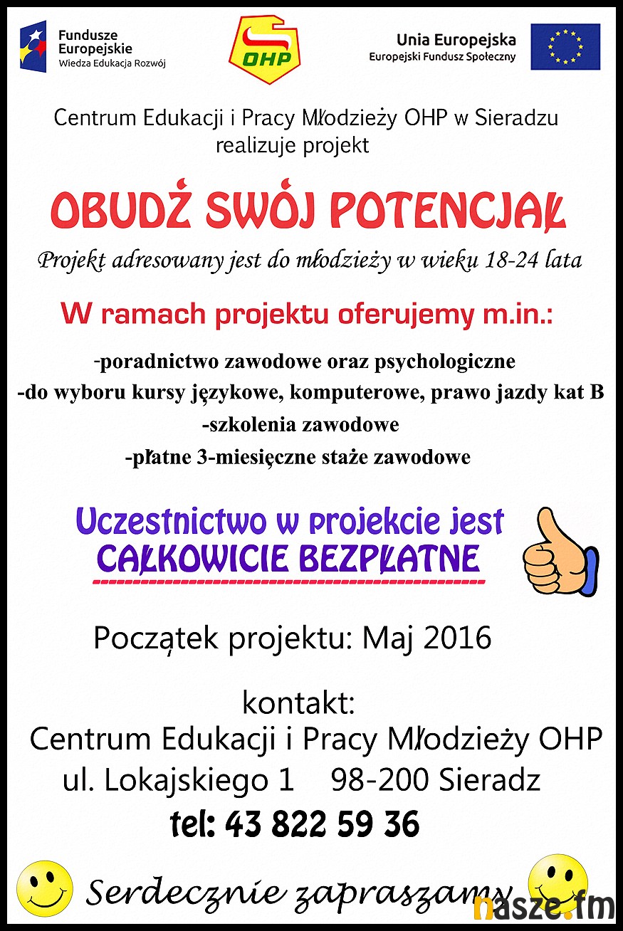 Centrum Edukacji i Pracy Młodzieży OHP w Sieradzu zaprasza do udziału w projekcie pn. Obudź Swój Potencjał, który rozpoczyna się już w maju br. Projekt skierowany jest do młodzieży w wieku 18-24 lata, nieaktywnej zawodowo i nieuczącej się.