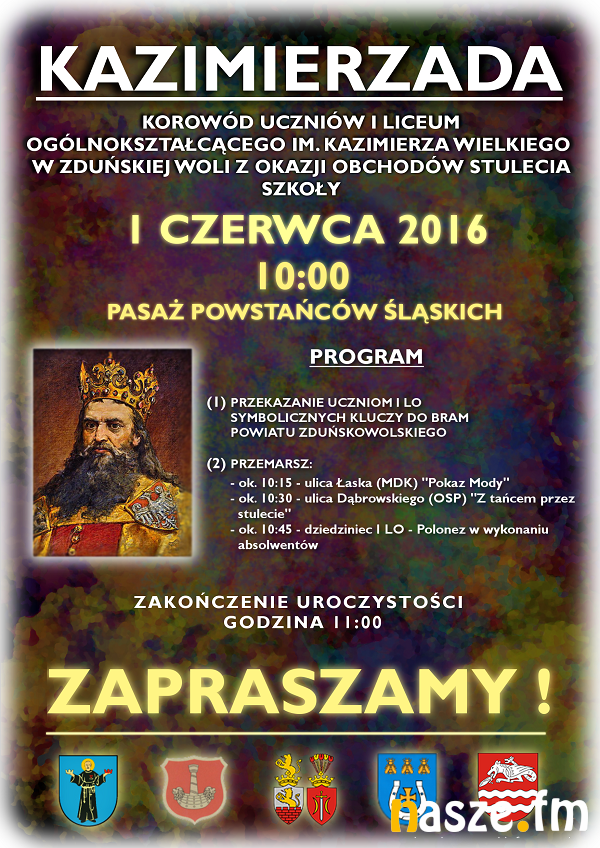 I Liceum Ogólnokształcące im. Kazimierza Wielkiego w Zduńskiej Woli obchodzi w tym roku jubileusz 100-lecia istnienia. Mimo, że główne uroczystości zaplanowano na październik to już jutro będzie można wziąć udział w barwnym korowodzie - Kazimierzadzie.
