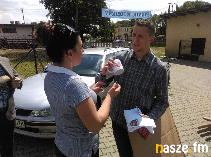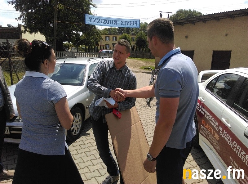 Tuż za panem Marcinem z Klonowej był u nas pan Marek ze Złoczewa, a trzeci pan Tomasz z żoną i córką, którzy przyjechali do Klonowej aż z Sieradza. Jak zawsze odnalezienie ekipy radiowców w terenie po podawanych na antenie podpowiedziach to jedno. Potem trzeba jeszcze wykonać wyznaczone zadanie. Ponieważ panowie Marcin i Marek byli na placu strażackim w Klonowej niemal jednocześnie to obaj dostali szansę walki o nagrody. Tym razem musieli odnaleźć firmę Kipard w Klonowej (sponsor konkursu), podać odpowiednie hasło i następnie przy pomocy farby jak najładniej napisać na kawałku tektury nazwę tejże firmy. Obaj panowie wykazali się pewnością ręki i po kilkunastu minutach byli z powrotem prezentując z dumą swoje dzieła. Na koniec były nagrody, gratulacje i uścisk dłoni sponsora konkursu. Kolejna edycja "Flagi na maszt" już za tydzień. Zapraszamy do wspólnej zabawy!
