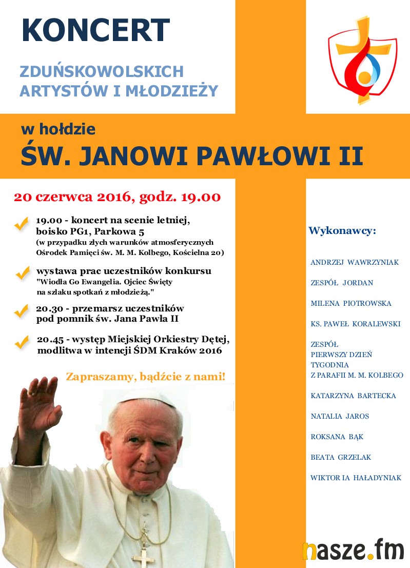 Dziś w Zduńskiej Woli odbędzie się koncert w hołdzie św. Janowi Pawłowi II. Odbędzie się on na scenie letniej na boisku Publicznego Gimnazjum nr 1 przy ul. Parkowej, a w przypadku złych warunków atmosferycznych zostanie przeniesiony do Ośrodka Pamięci Świętego Maksymiliana przy ul. Kościelnej. Początek tego wydarzenia o godz. 19.