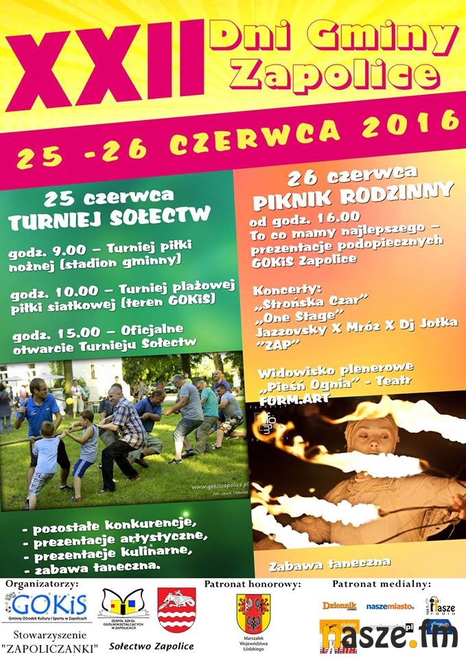 W najbliższy weekend świętować będzie Gmina Zapolice. W sobotę (25.06) na terenie tamtejszego Gminnego Ośrodka Kultury i Sportu odbędzie się Turniej Sołectw. Z kolei na niedzielę (26.06) zaplanowano Piknik Rodzinny.